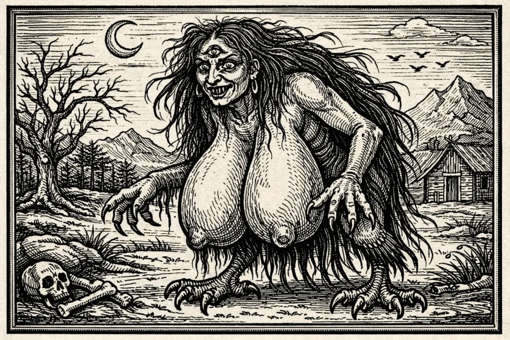 Уродливая трехглазая женщина с длинными спутанными волосами, абсолютно нагая, со звериными или птичьими лапами и с огромной грудью, свисающей почти до земли – так выглядит самое знаменитое демоническое существо у тюркских народов.
