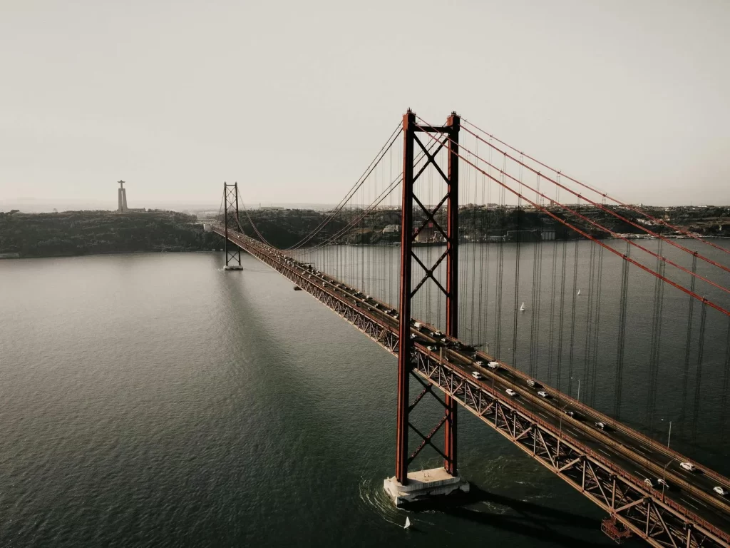 Автомобильное путешествие по стране начинается, как и положено, от аэропорта, который в Лиссабоне находится чуть ли не в центре города. Прямо по курсу – мост Васко да Гама, один из самых длинных вантовых мостов в Европе. Его протяженность – более семнадцати километров. Он идет через реку Тежу, которая здесь впадает в Атлантический океан.